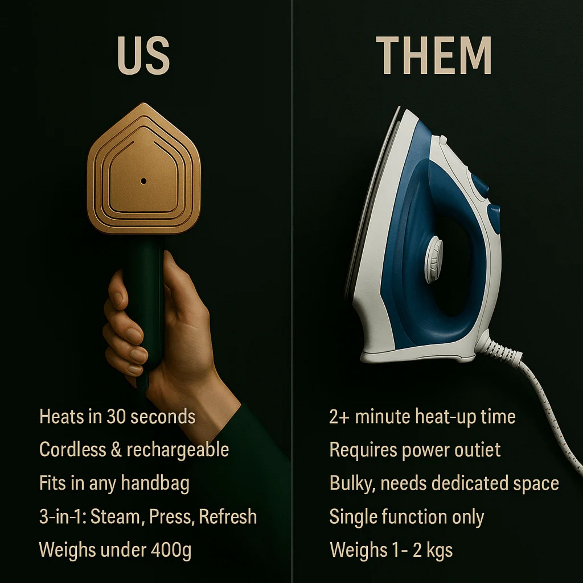 Experience the ease of ironing anywhere in just 30 seconds. QuickPress is your portable solution for crisp, wrinkle-free clothes on the go.